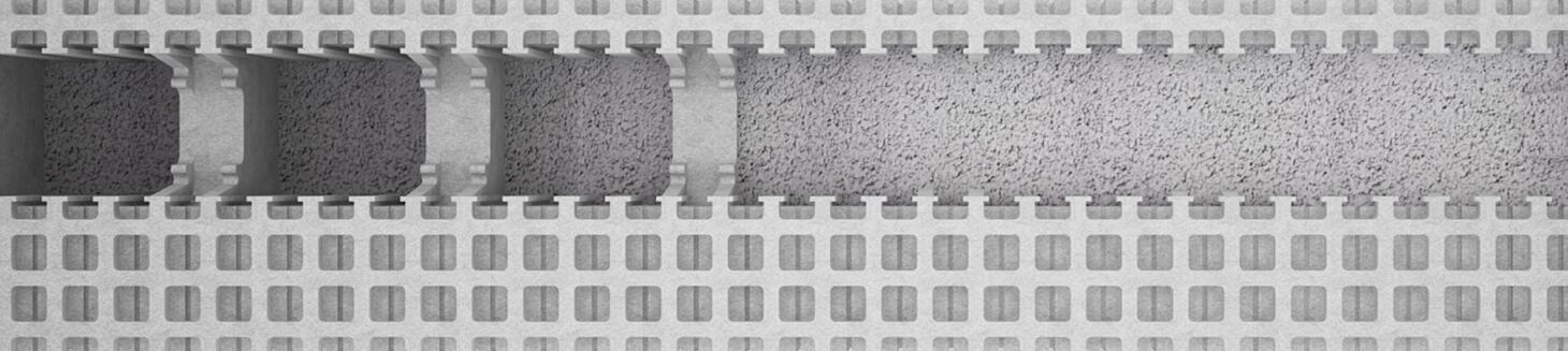 Les éléments sont adaptés au pompage du béton. La hauteur de bétonnage suggérée est de 3 m, soit la hauteur d’un étage. Le bétonnage d’un étage d’une maison d’une superficie d’environ 100 m2 représente environ 12 m3 de béton et moins de 2 heures de travail. Il est recommandé d’utiliser un béton de consistance plastique et d’une granulométrie maximale de 8 mm, dont la classe de résistance n’est pas inférieure à C16/20, toujours en accord avec le projet de construction. Nous mettons en place le béton par couches en faisant tourner la pompe autour du périmètre du bâtiment à une hauteur d’environ 0,8-1m, c’est-à-dire en faisant 3 tours.